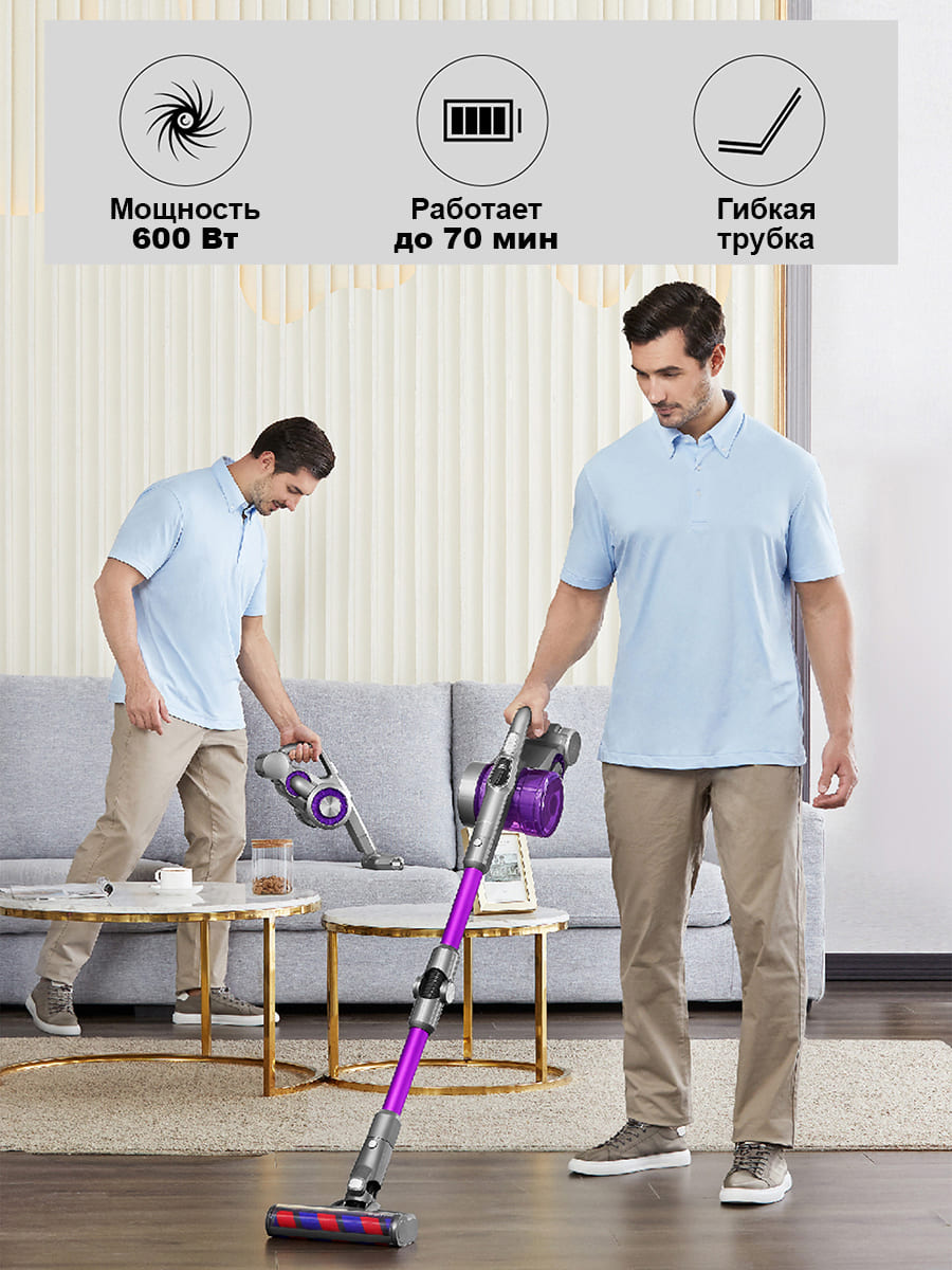 Беспроводной пылесос оснащен бесщеточным двигателем со скоростью 100000 об/мин, который обеспечивает мощность всасывания 200 АэроВт при давлении 25000 Па. Время автономной работы составляет 70 минут. Встроенный экран показывает информацию об уровне заряда аккумулятора и выбранном режиме работы. В комплекте идут дополнительные насадки.