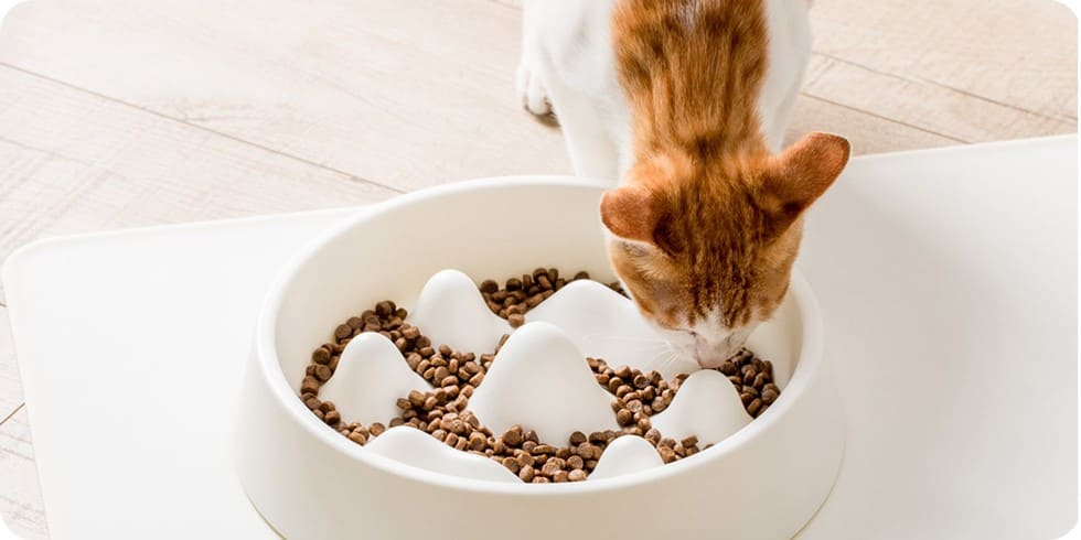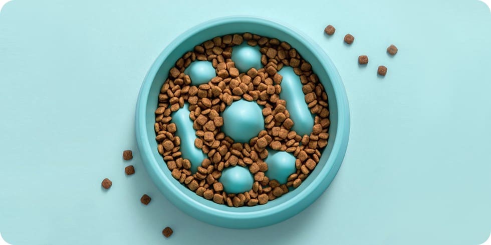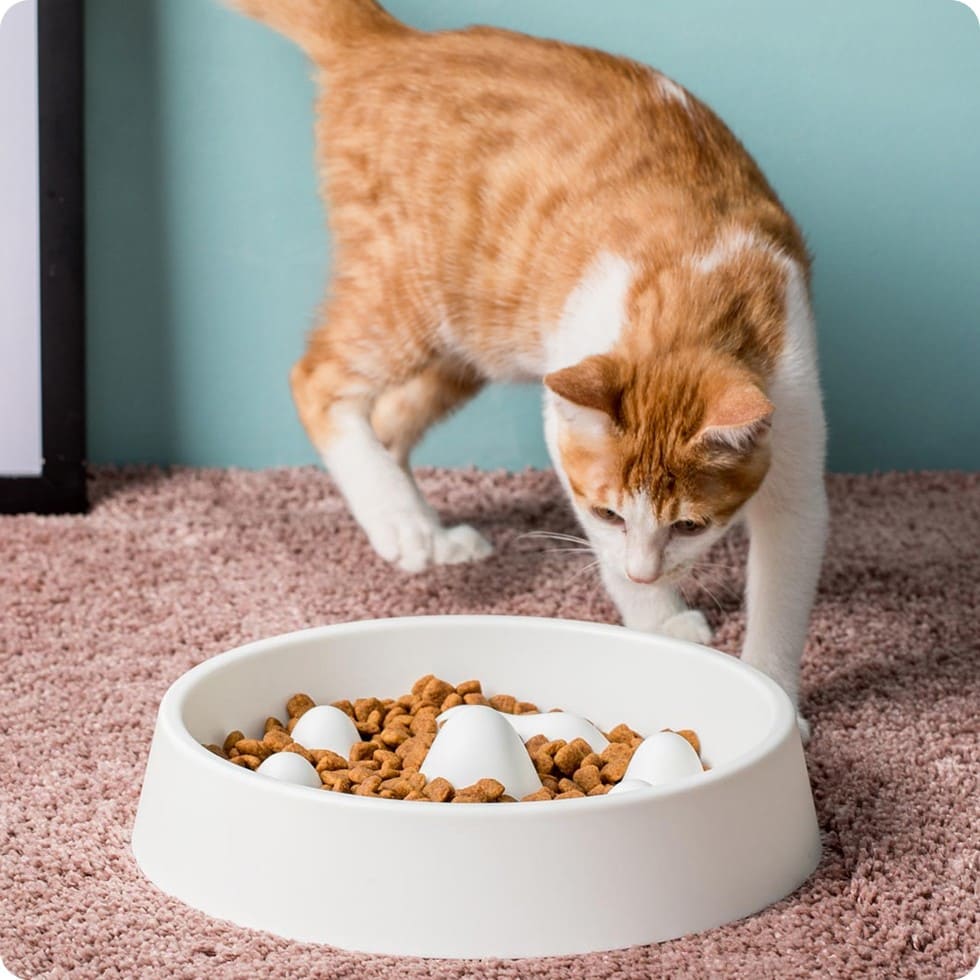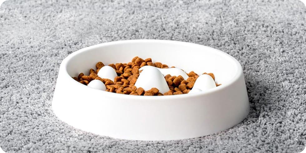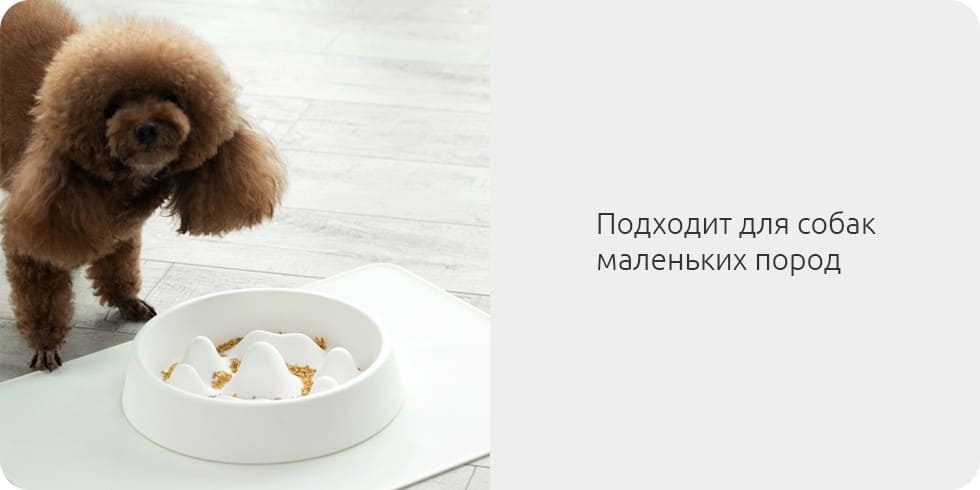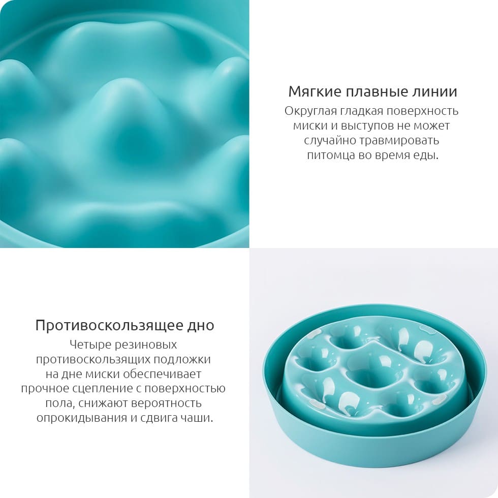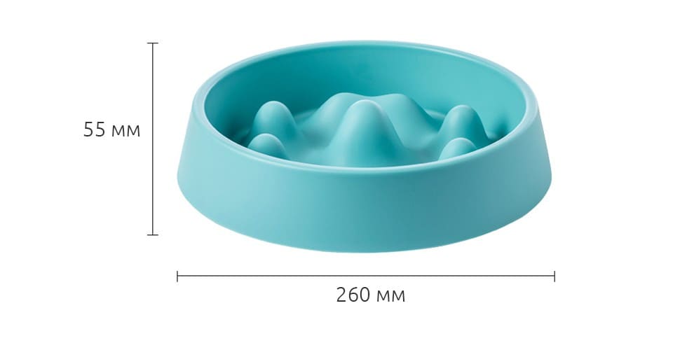 Дно миски с «горными» выступами имитирует природный неровный рельеф земли. Миска естественным образом вынуждает питомца снижать скорость потребления пищи и тщательнее пережевывать её. Это научно доказанный способ защитить здоровье любимца.