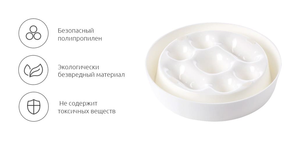 Тщательно отобранный полипропилен, из которого изготовлена миска, является экологически безопасным. Он не содержит металлических частиц, устойчив к появлению царапин и может безопасно контактировать с пищей. Миска не боится ни падений, ни зубов маленького друга.